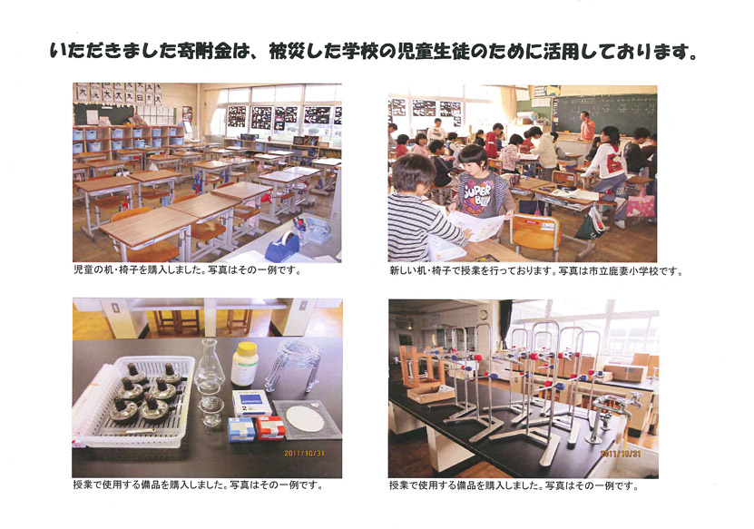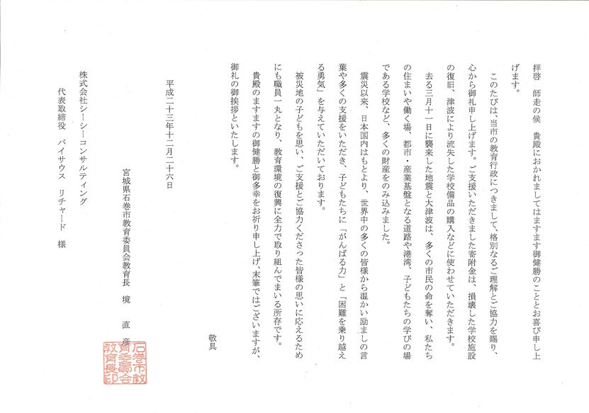 2011年3月11日に発生した東日本大震災を受け、被害にあわれた地域の皆様へ少しでもお力添えできればと弊社シー・シー・コンサルティングでは「外国人の恩返し」Tシャツを製作いたしました。売上げは石巻市教育委員会へ寄付され、子供たちが学習する場を失わないよう勉強机やイス・授業で使用される備品等が購入されました。